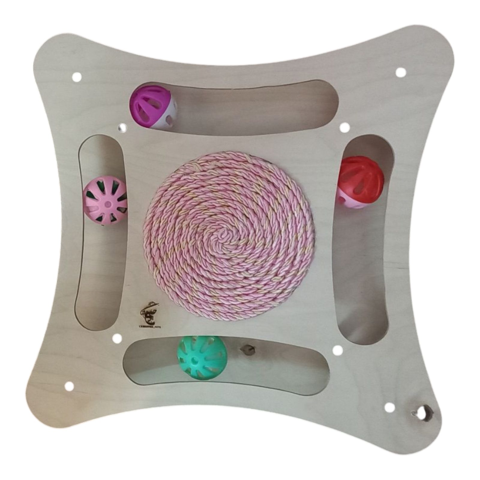 اسباب بازی گربه مدل اسکرچر توپ زندانی که دارای ۴ عدد توپ جغجغه ای که قابلیت حرکت در اسباب بازی را دارد و هم چنین قسمت وسط دارای اسکرچر میباشد که گربه میتواند با پنجه هایش هم بازی کند.